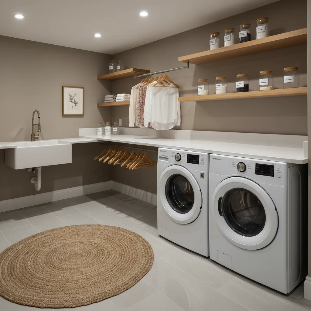 Functional Upgrade: Install a large countertop over your washer and dryer for folding clothes. Add a hanging rod for delicates and open shelves for detergent jars. When the space looks beautiful, the chore feels less like work.