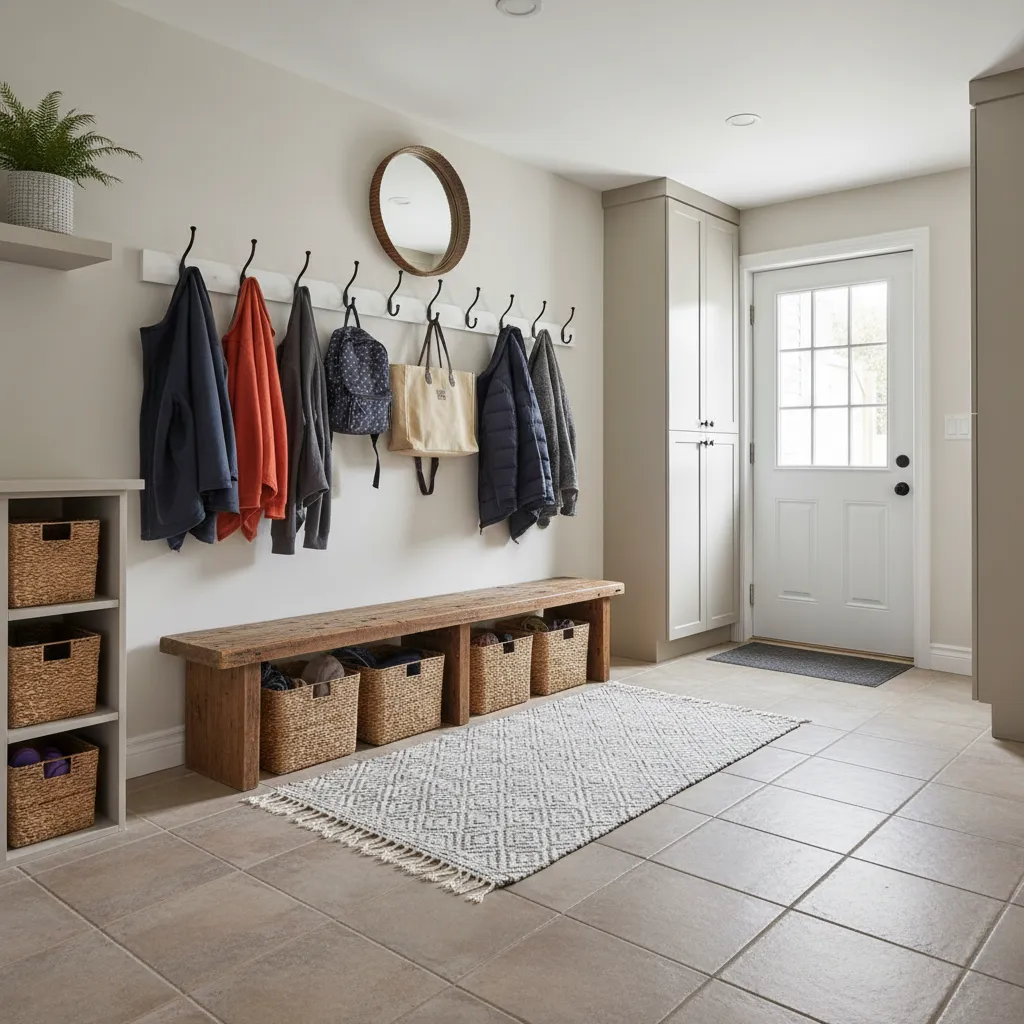 Practicality: Use durable tile flooring that creates a designated “dirty zone.” Install hooks at varying heights so kids can reach their own jackets. A sturdy bench is essential for taking off shoes comfortably.