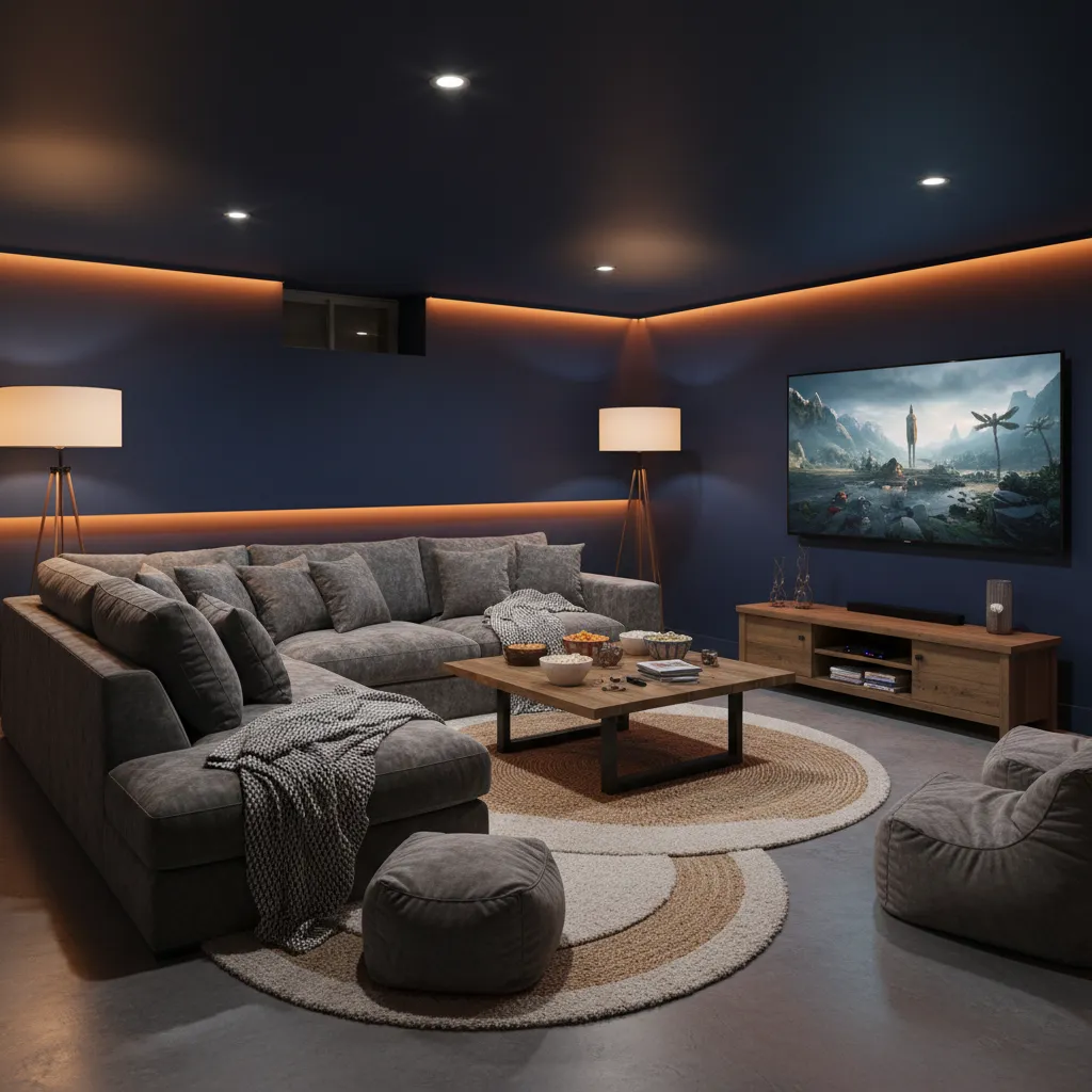 Design Tip: Choose a massive sectional sofa with durable fabric like velvet or performance linen. Darker wall colors—think navy, charcoal, or forest green—help absorb light, making the screen pop and the room feel like a true cinema. Don’t forget blackout curtains if you have small egress windows.