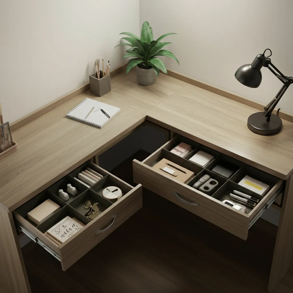 For a clean, integrated look, select a corner desk that comes with built-in shelves or drawers. This provides seamless storage and helps maintain a tidy appearance.