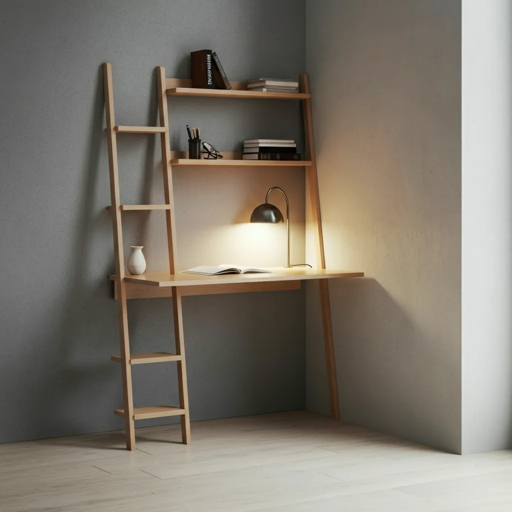 A ladder desk leans against the wall, offering a compact footprint with built-in vertical shelving. It’s a stylish, modern solution that provides both a workspace and storage in one sleek package.