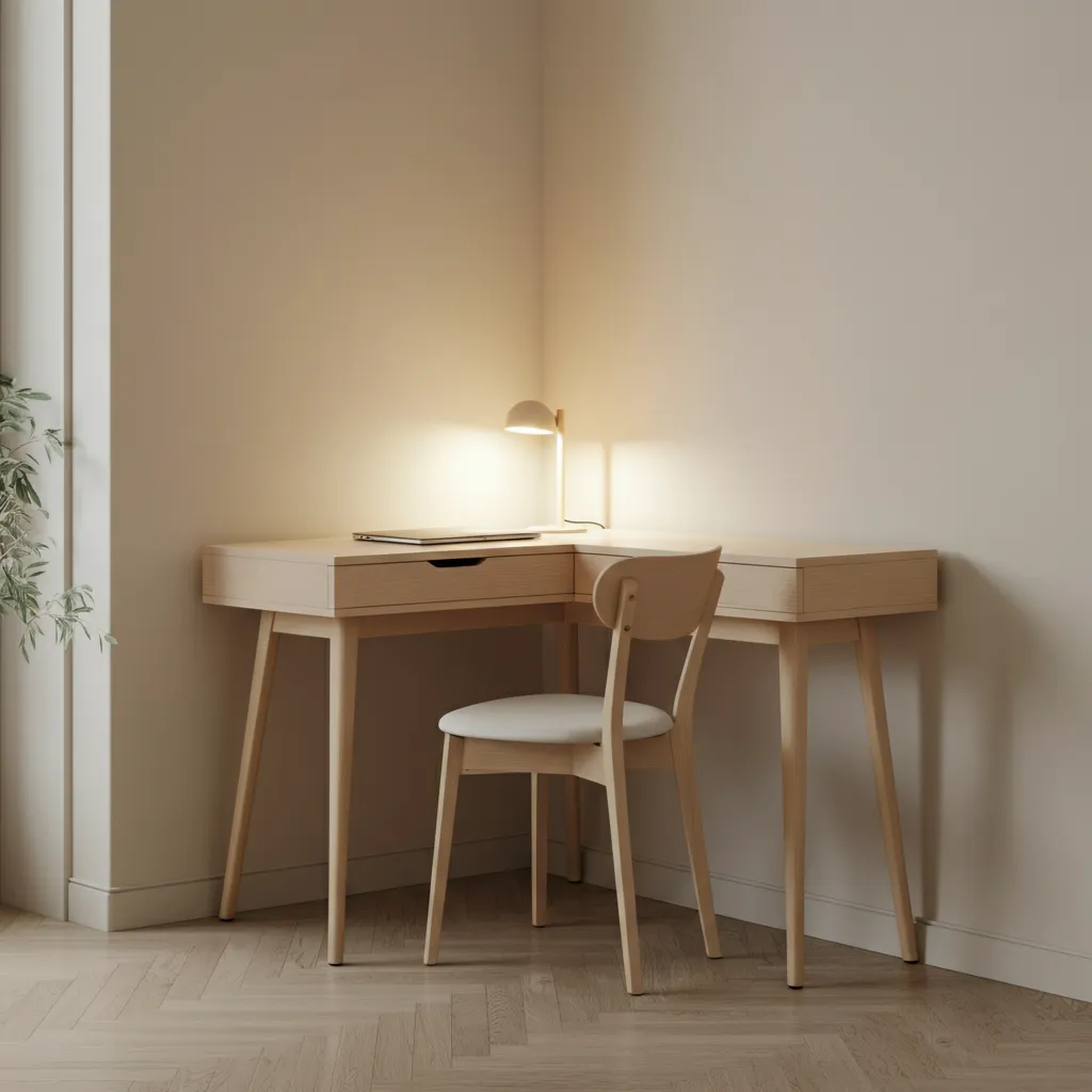 Choose a desk with a slender frame and thin legs. A visually lightweight desk prevents the corner from feeling cramped. Desks with glass tops or light-colored finishes can also help maintain an airy feel.