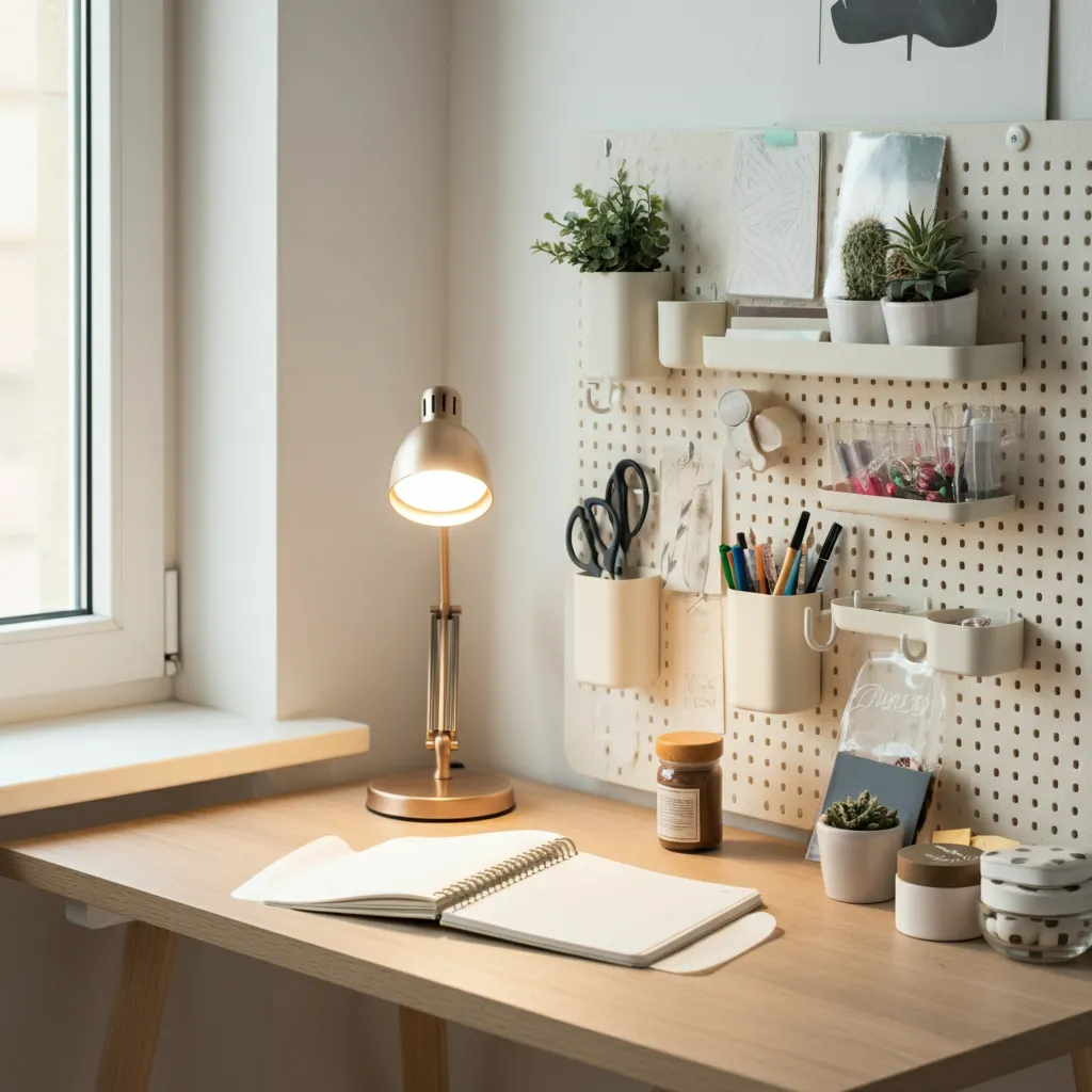 A pegboard mounted on the wall is the ultimate customizable organization system. Use hooks, shelves, and cups to arrange your pens, scissors, notebooks, and other essentials exactly where you need them.