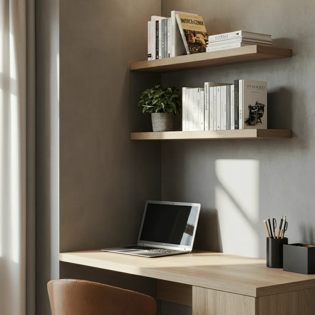 When you can’t build out, build up. Install floating shelves above your corner desk to hold books, supplies, and a few decorative items. This keeps your work surface clear while adding a personal touch to your study nook.
