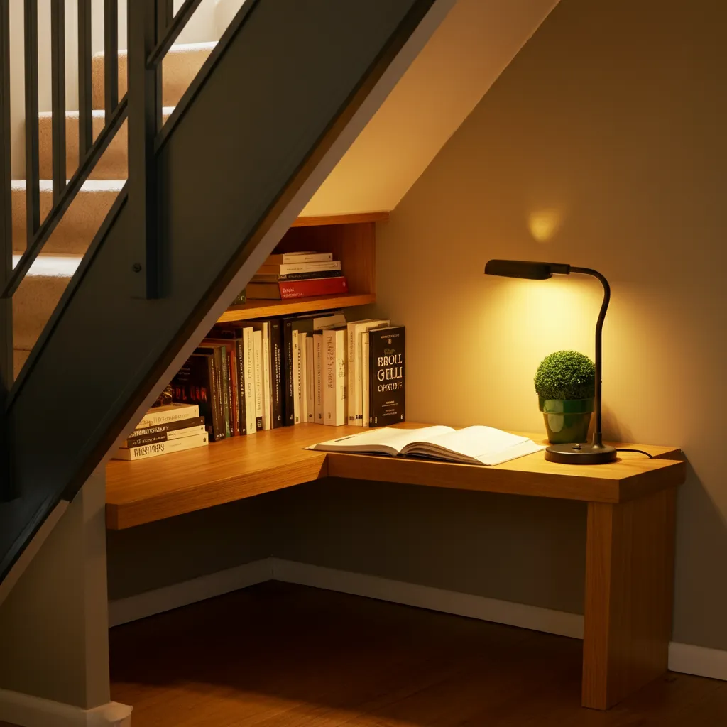 The awkward corner under a staircase is prime real estate for a built-in desk. A custom-fit desktop and some shelves can turn this forgotten space into a charming and highly functional study nook.