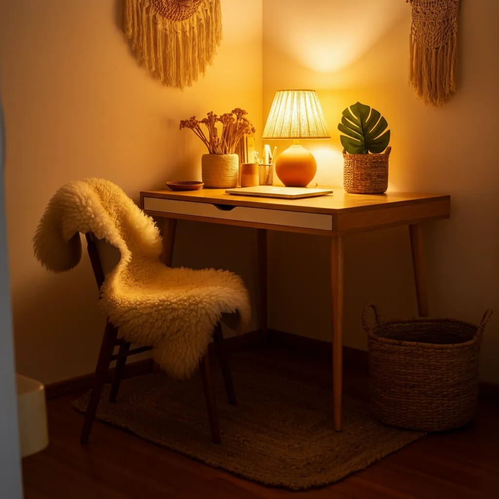 Make your corner cozy with soft textures. Add a plush sheepskin throw over your chair, place a small, soft rug underfoot, and use woven baskets for storage. These elements add warmth and comfort.