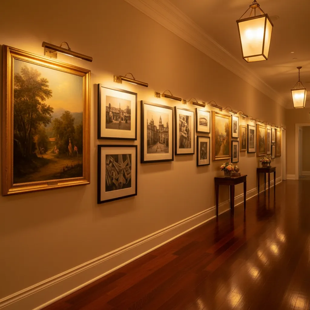 If your hallway doubles as a gallery for family photos or favorite art pieces, picture lights are a must. These small, focused lights are mounted above your frames, drawing attention to the artwork and adding a layer of sophisticated accent lighting.