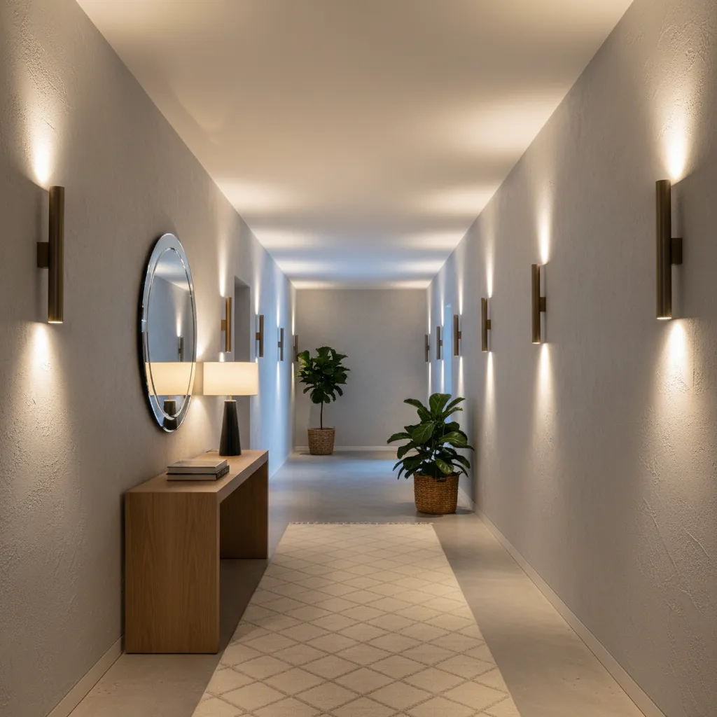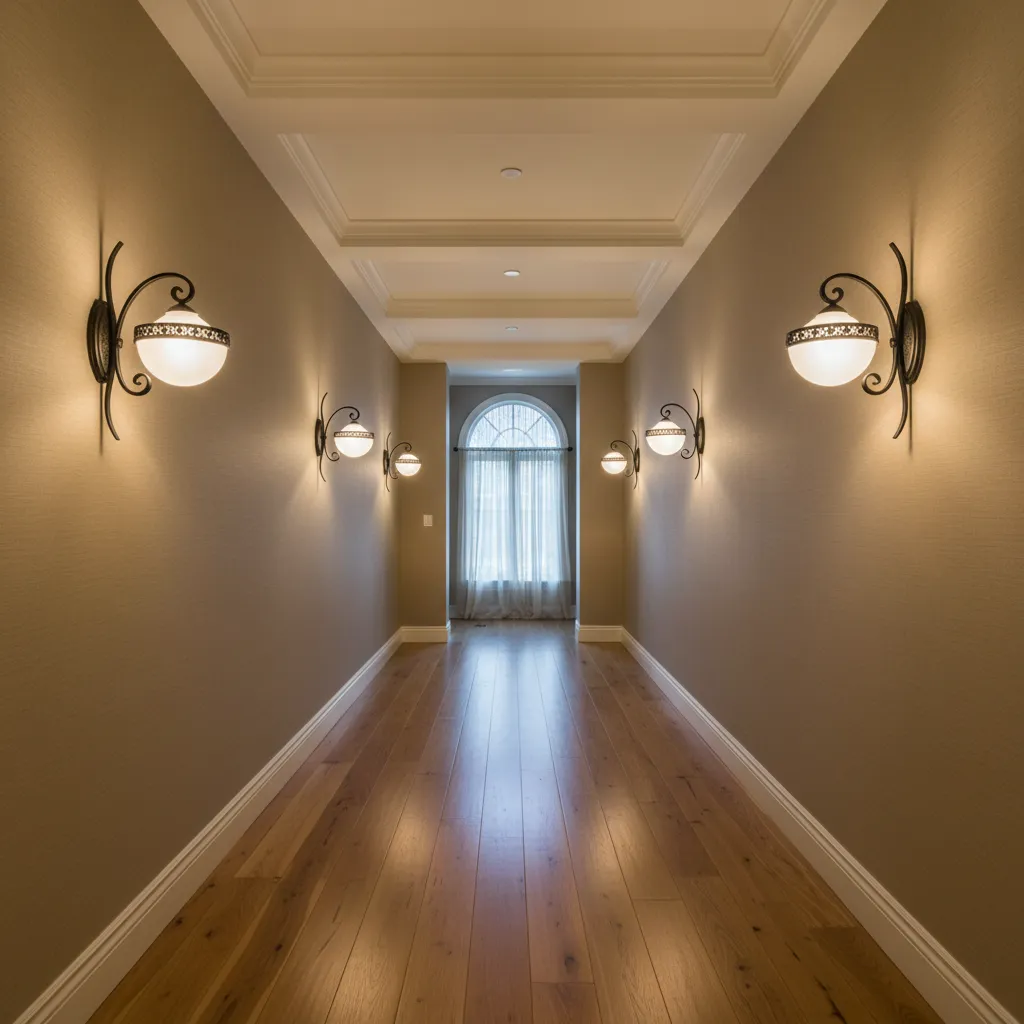 Wall sconces are a timeless choice for hallways. They provide soft, indirect light that creates a cozy and inviting atmosphere. Install them in pairs or in a series along the length of the hall. This approach not only illuminates the space but also adds a pleasing sense of rhythm and symmetry.
