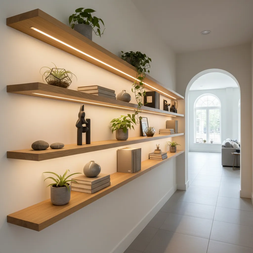 Install floating shelves to display small plants, books, or decorative objects. This adds depth and functionality to your hallway while keeping it stylish and organized.