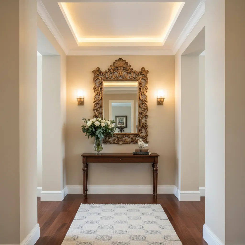 A large, decorative mirror not only adds elegance but also makes your hallway appear larger and brighter. Choose a mirror with an ornate frame for a classic touch or a sleek, modern design for a contemporary vibe.