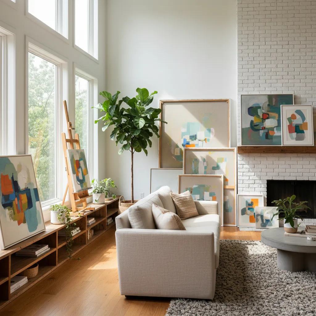 Yes! Mirrors and light-colored art can reflect light and create the illusion of space. Vertical artwork or tall shelving units draw the eye upward, making the room feel taller and more open. Minimalist or geometric designs also help maintain a clean, spacious feel.