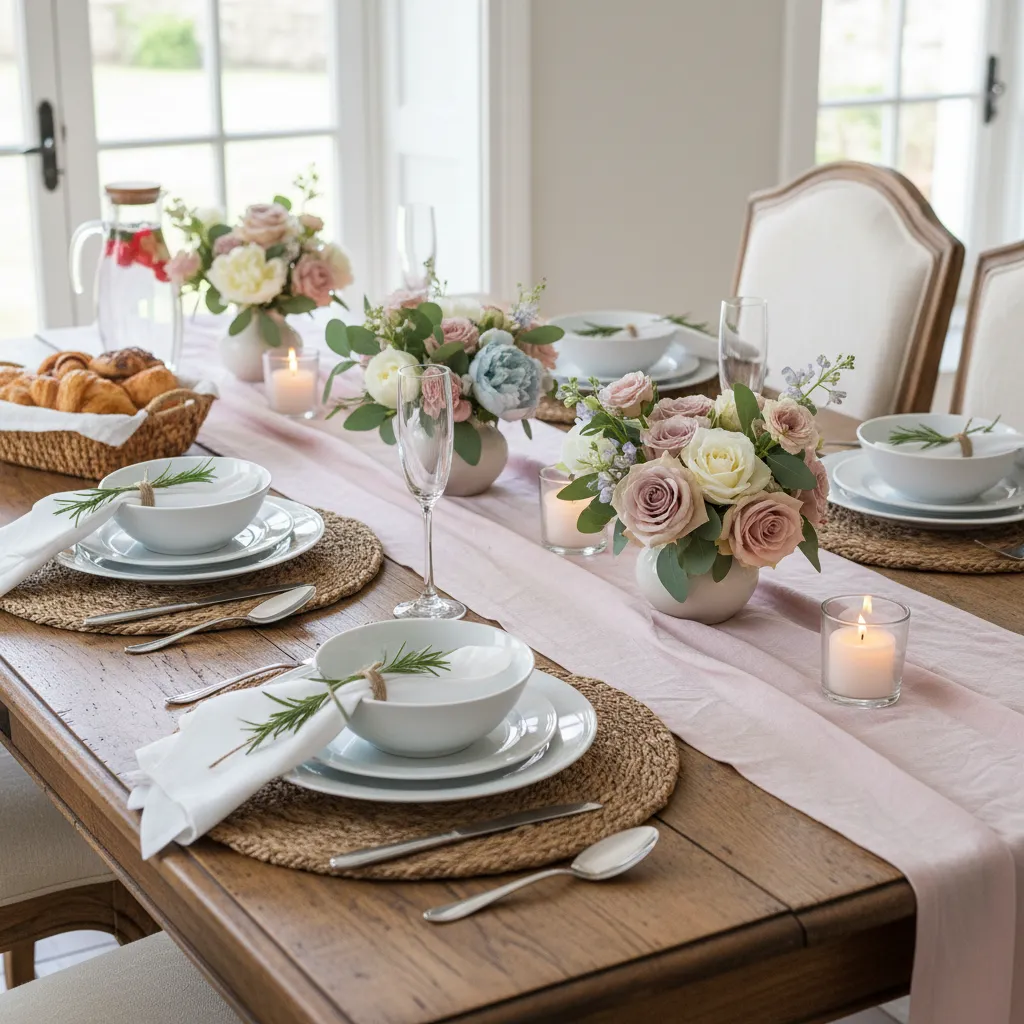 If you plan on serving a delicious Mother’s Day meal, the dining table should be the star of the show. Layering is the key to a gorgeous tablescape. Start with a high-quality linen table runner in a soft pastel shade like blush pink, sage green, or French blue. Add woven placemats for a touch of natural texture, and pull out your best dinnerware to make the meal feel like a true event.