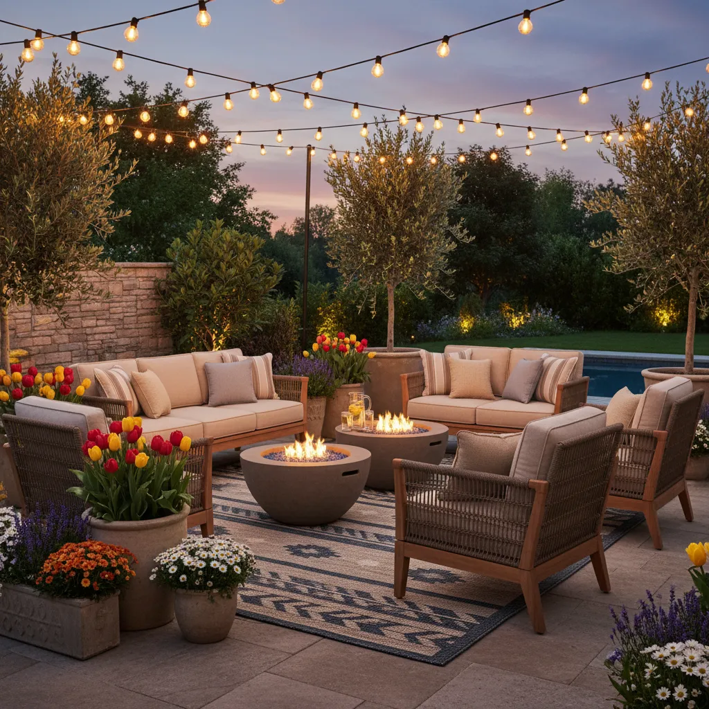 Hang a string of warm white café lights above the seating area to create a magical ambiance if the celebration extends into the evening. Pot some fresh spring annuals in decorative planters and place them around the seating area. A stylish outdoor rug can anchor the space, making your patio feel like an organic extension of your indoor living room.
