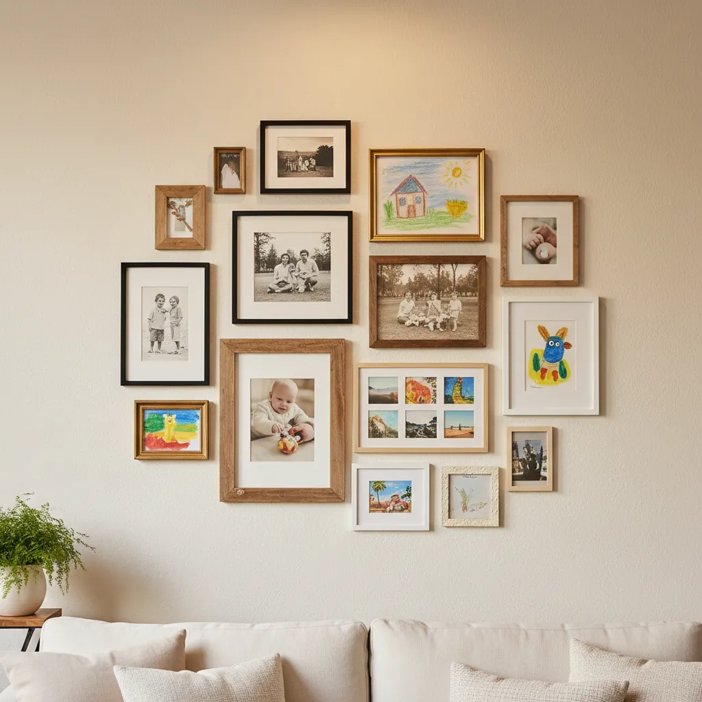 Mix and match your frames using different textures like natural wood, matte black, or brushed brass to give the wall a curated, designer feel. If you want to make a larger statement and combine photography with artistic flair, consider how Vibrant DIY Wall Murals can serve as a stunning backdrop for your framed memories, adding a splash of personalized color to the room.