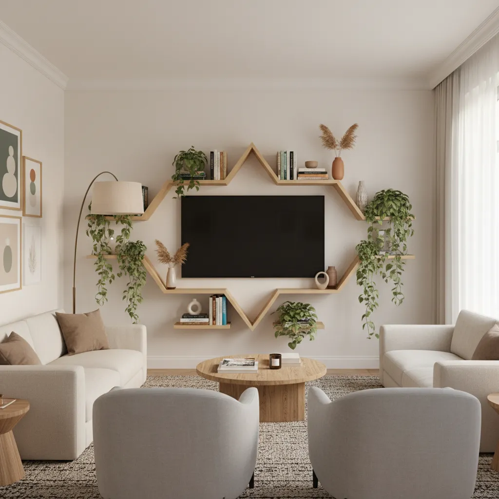 - Create a Visual Triangle: Arrange your shelves and TV to form a loose triangular shape to guide the eye naturally across the wall.