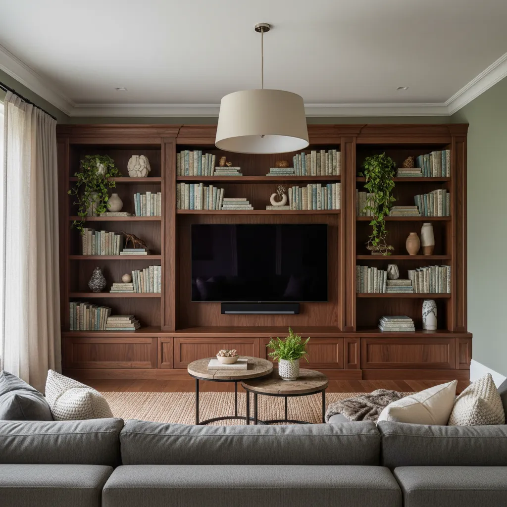 A built-in entertainment center offers a polished, high-end solution that combines storage and style. It frames the TV perfectly while providing ample space for media devices, books, and decorative objects.