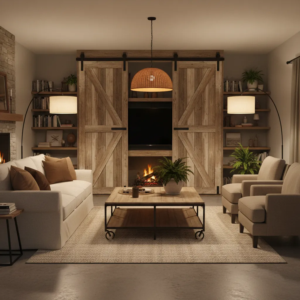 - Barn Doors: Install a small set of sliding barn doors on a track above the TV. You can slide them open for viewing and closed to hide the screen.