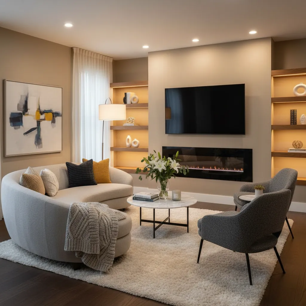 - Adjacent Placement: For better viewing ergonomics, consider placing the TV on a console or built-in to the side of the fireplace. This allows you to mount the TV at a more comfortable eye level and creates a balanced, asymmetrical layout.