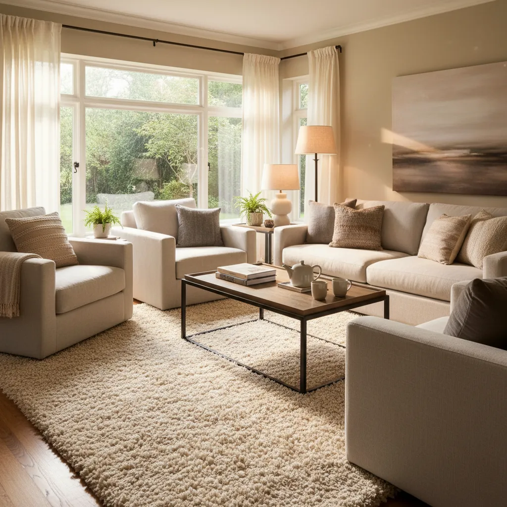 A bare floor lacks warmth and acoustic dampening. Adding a textured rug instantly grounds the room and provides a soft surface underfoot.