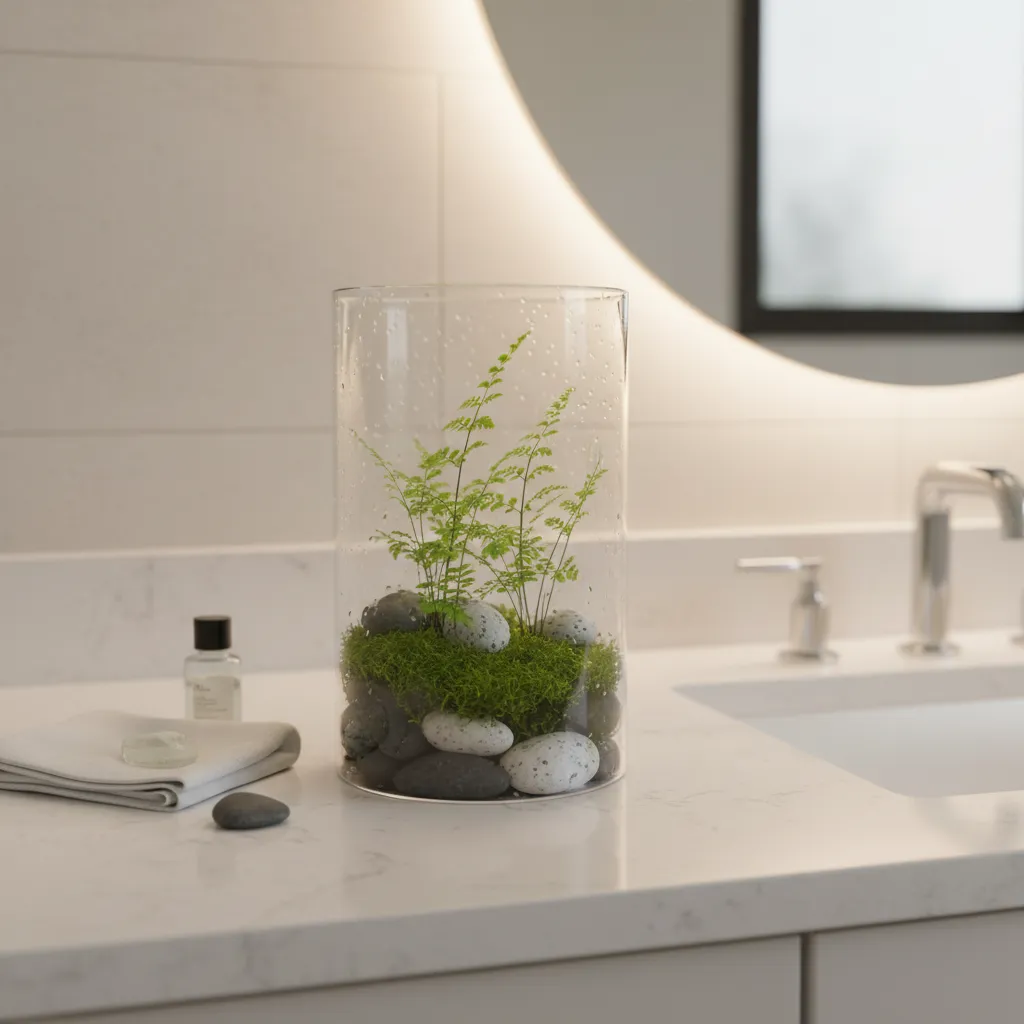 Create a mini terrarium with moss, small ferns, and decorative stones. Place it on your vanity for a touch of nature that’s easy to maintain.