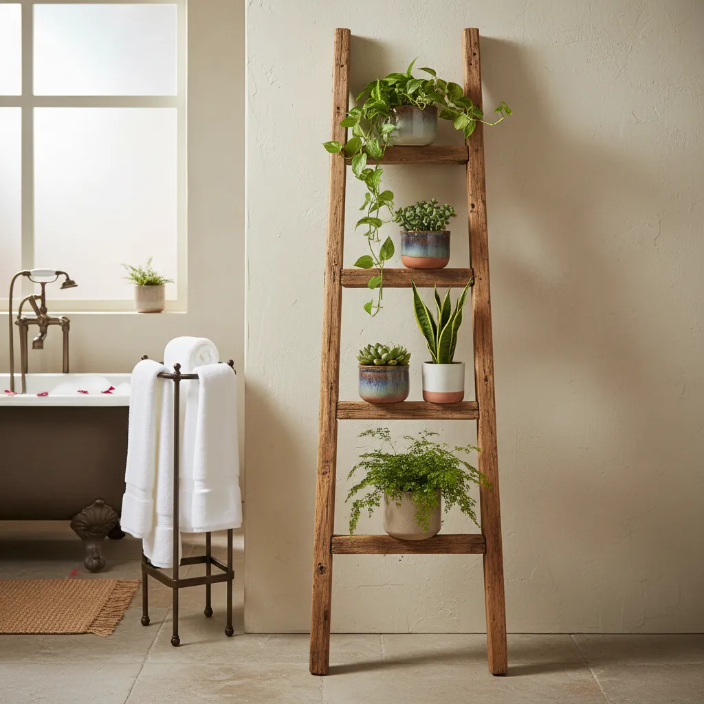 A wooden ladder can double as a plant stand. Drape towels on one side and place small pots on the rungs for a rustic, farmhouse feel.