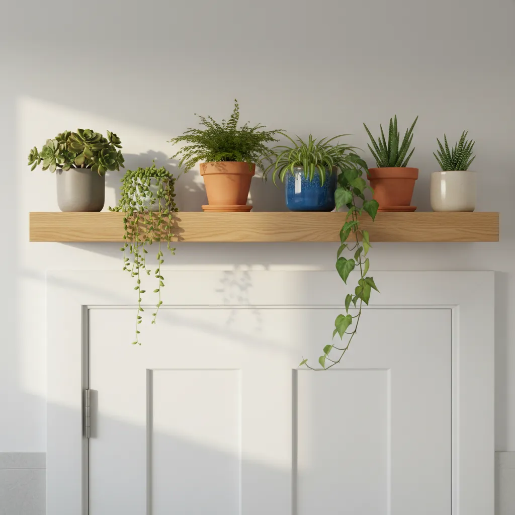 Utilize the space above your bathroom door by installing a shelf for plants. This unexpected placement adds interest and makes use of otherwise wasted space.