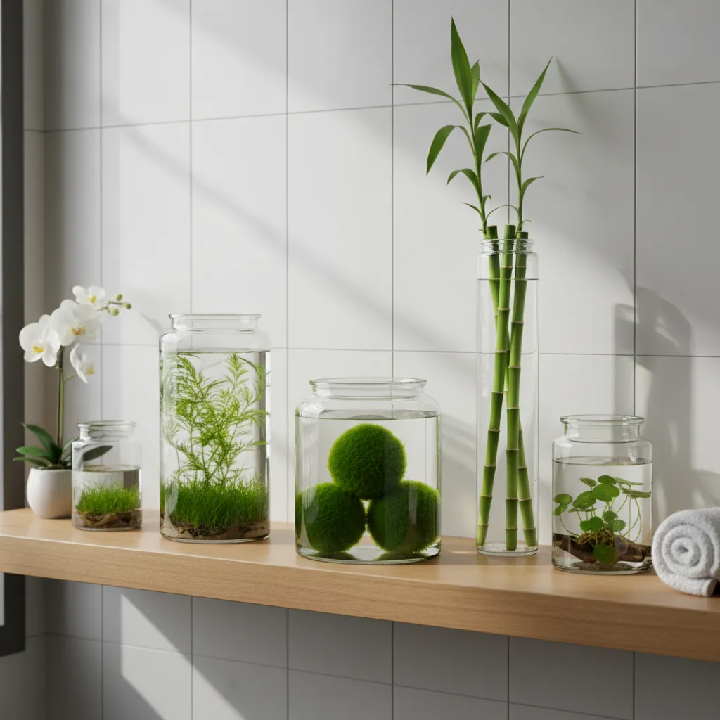 Add a unique touch with aquatic plants like lucky bamboo or marimo moss balls in glass jars filled with water. These are perfect for bathrooms with limited natural light.