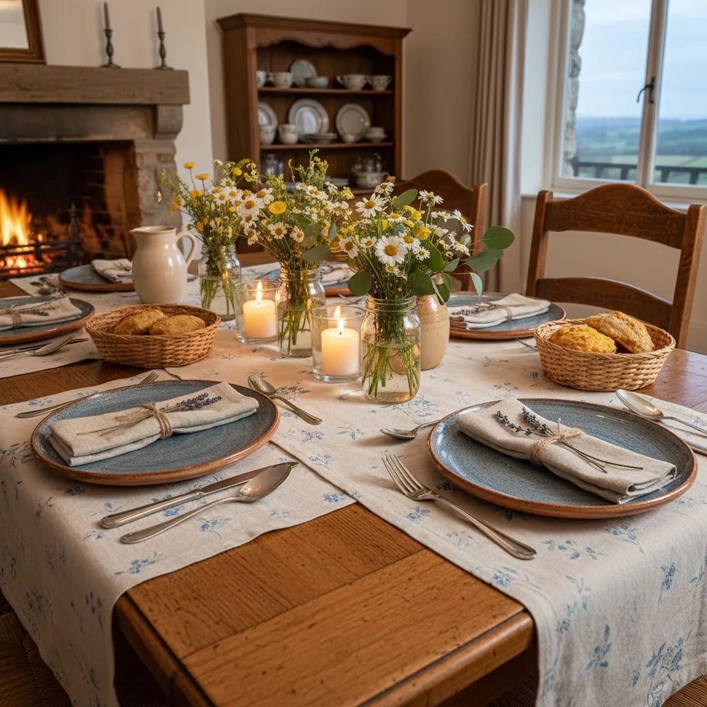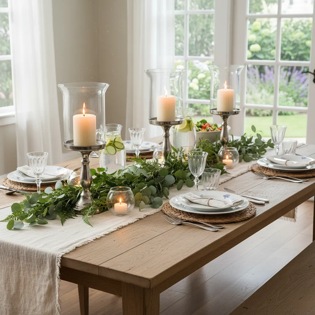 Prepare for summer gatherings with a beautiful tablescape. Combine a simple runner, fresh greenery, and candles in hurricane glasses for an elegant yet relaxed feel. For more tips, explore these Warm and Inviting Table Decor Ideas.