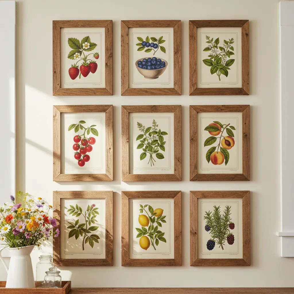 Frame a series of vintage-style botanical prints and hang them in your kitchen or dining area. Choose illustrations of summer fruits, herbs, or flowers to tie into the seasonal theme.