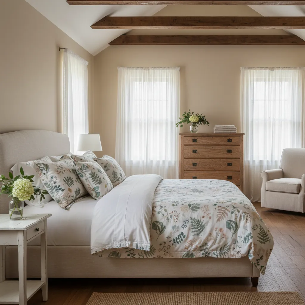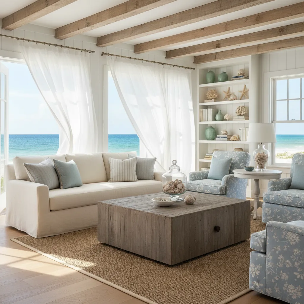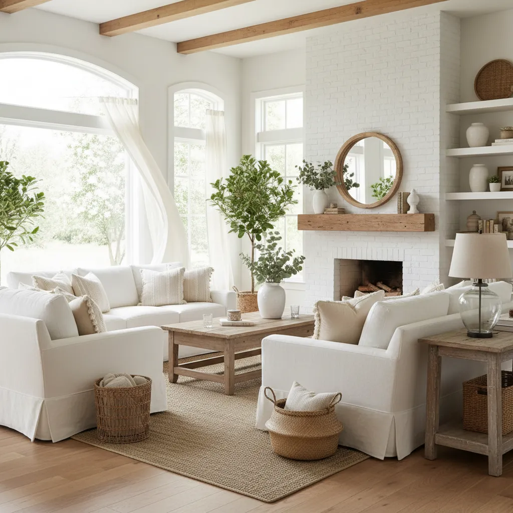 Incorporate subtle coastal elements like muted blue pillows, weathered wood accents, and seashell displays. This blend of styles creates a serene, vacation-like feel without straying too far from classic farmhouse charm.