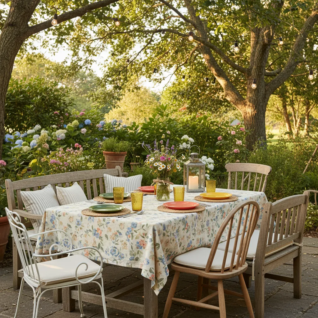 Set up a simple dining table and chairs on your patio or deck. A vintage tablecloth and some unbreakable dinnerware make it easy to enjoy meals al fresco all summer long.