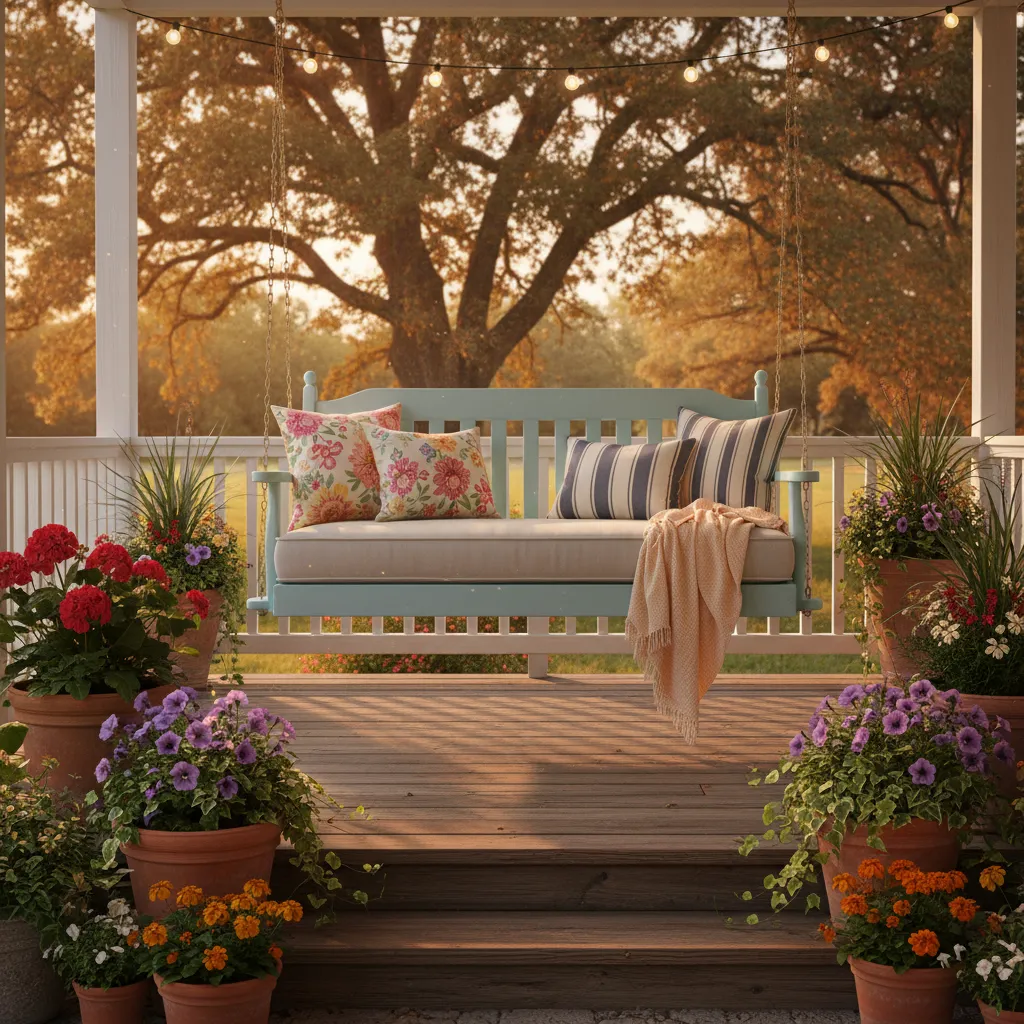 A porch swing or hanging chair is the quintessential farmhouse feature. Add comfortable cushions and a throw blanket for cool evenings.