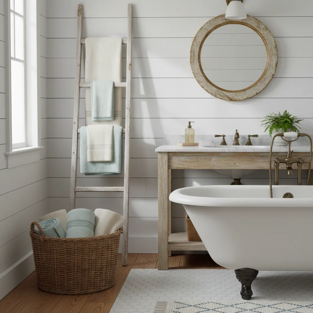 Swap out dark, plush towels for lighter-colored ones in white, light gray, or soft blue. Display them on a rustic ladder or roll them in a wicker basket.