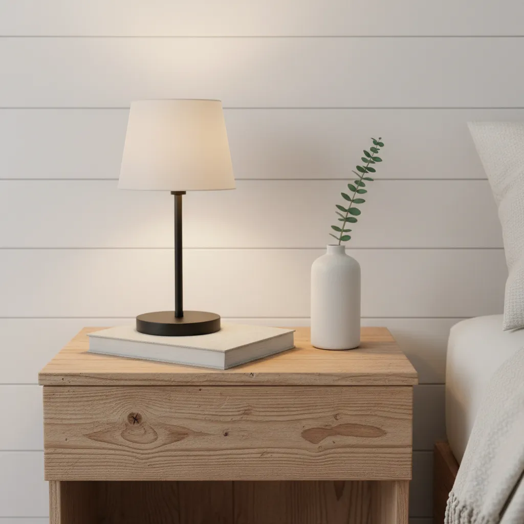 Simplify your bedside table for a more serene feel. Keep only the essentials: a small lamp, a book, and a little vase with a single flower sprig.