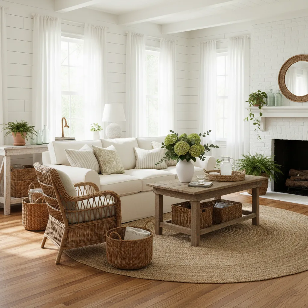 Natural wood, rattan, linen, cotton, jute, and galvanized metal complement the farmhouse look. These materials add warmth and texture while keeping the space light and relaxed.