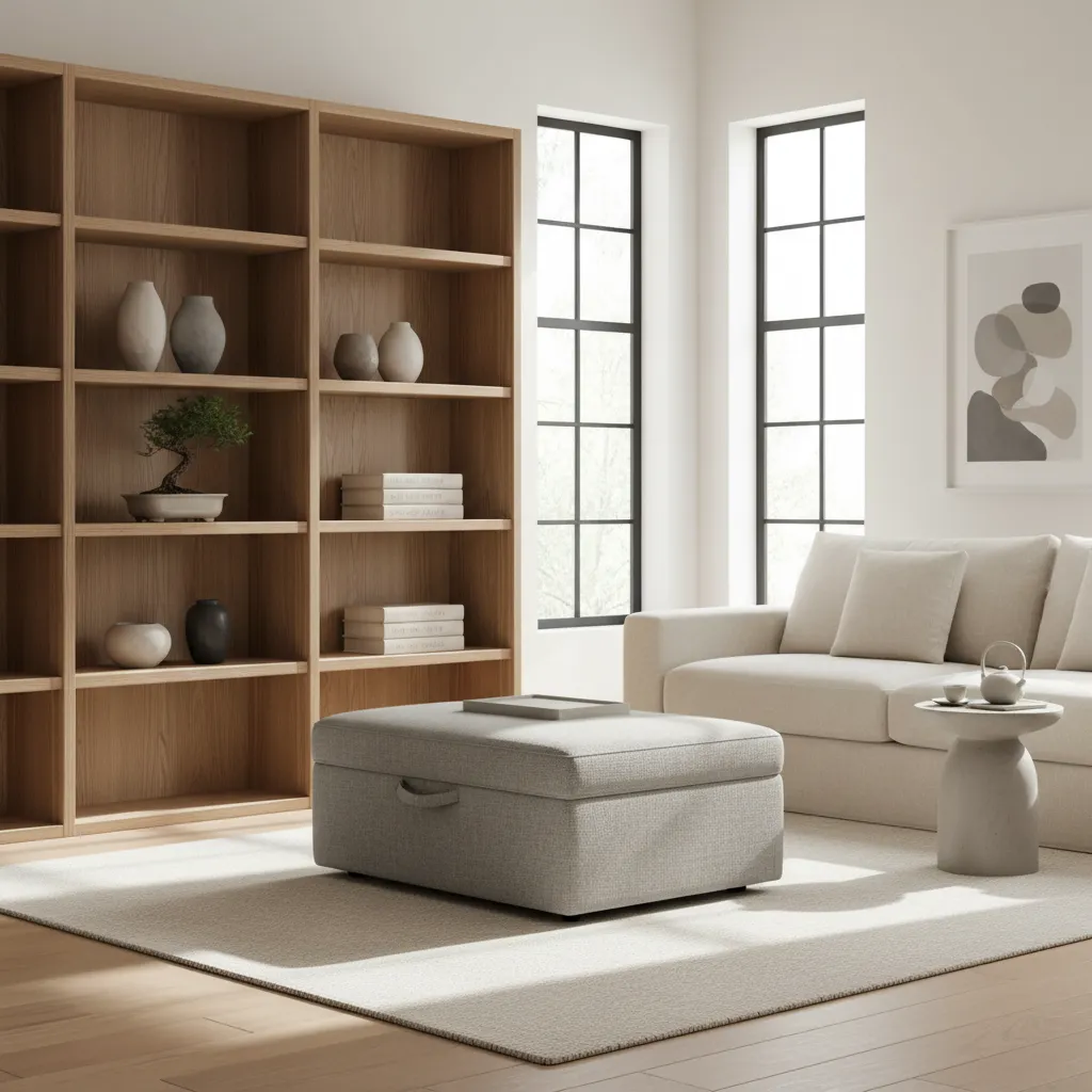 Japandi requires a clutter-free look. Use furniture with built-in storage, like storage ottomans or beds with drawers underneath, to hide away daily items.