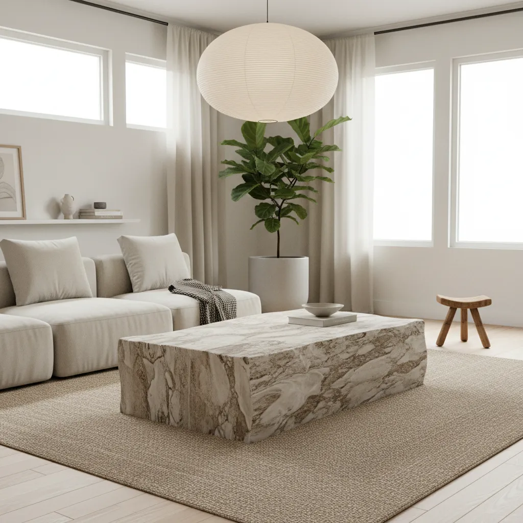 Introduce natural stone or matte concrete through coffee tables or planters. These raw materials provide a stunning contrast against soft fabrics.