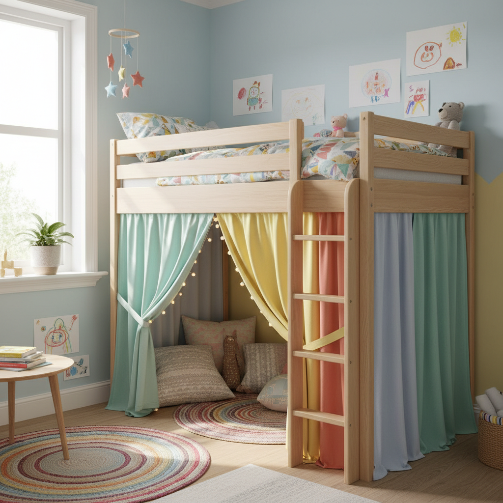 - Decor Idea: Hang curtains around the bottom of the loft bed to create a “secret hideout” or a theater stage for puppet shows.