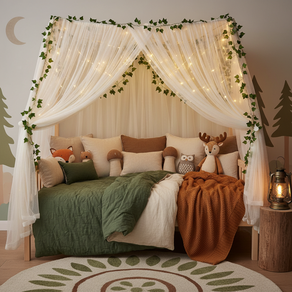 - Decor Idea: For a forest theme, weave artificial ivy vines through the canopy netting. It creates a secret garden vibe right inside their home decor.