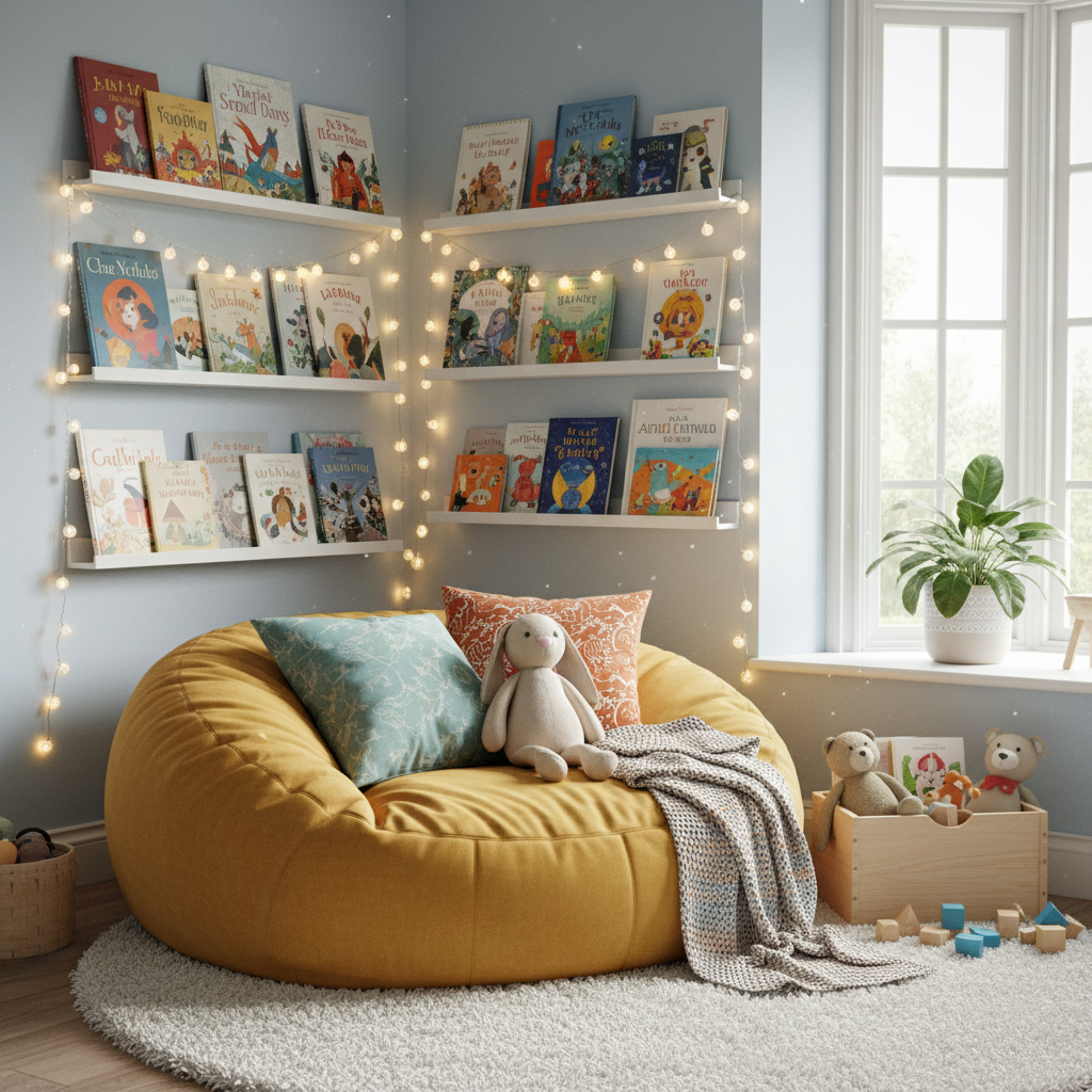 - Tip: Install shelves at a low height so your child can reach their favorite stories easily. Add a warm reading light or fairy lights to make the spot feel magical in the evenings.