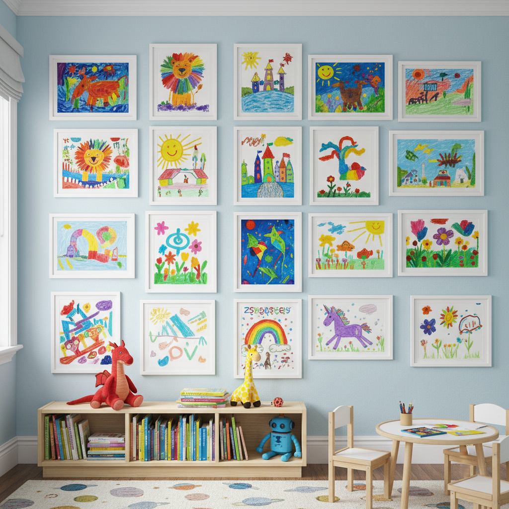 - Practical Tip: Use matching frames to keep the look cohesive, or use clipboards mounted on the wall for an easily rotating display of their latest masterpieces.