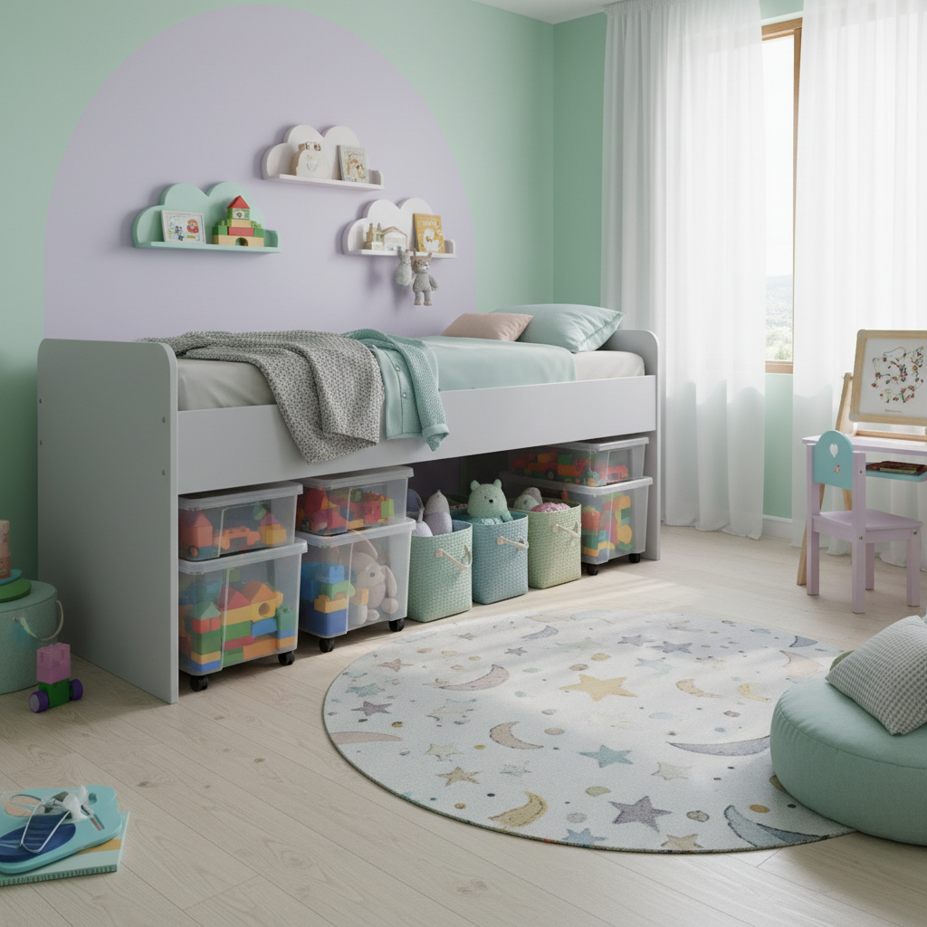 Clutter is the enemy of a peaceful bedroom. Utilize the space under the bed for storage bins or drawers. This keeps toys off the floor and maximizes floor space for play.