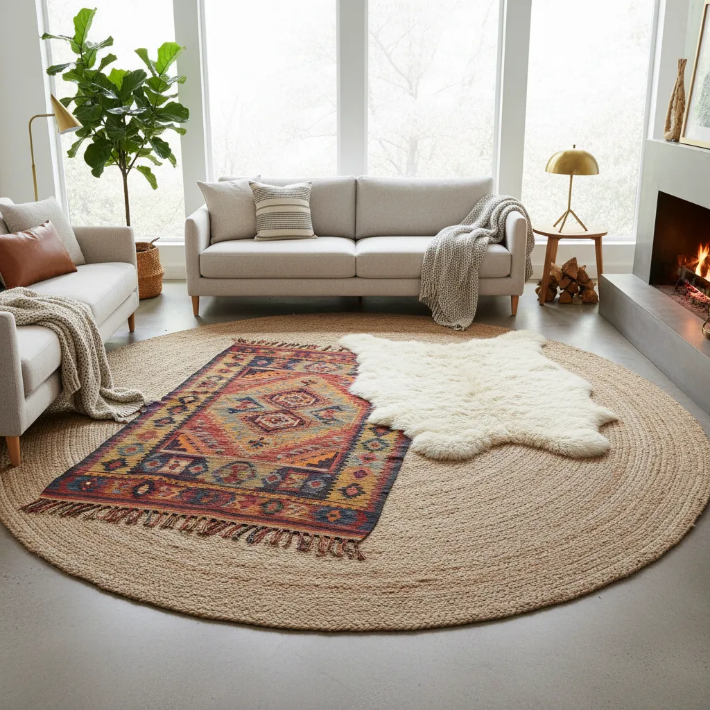 If you have a large, neutral sisal or jute rug, you can layer a smaller, patterned rug on top of it. A vibrant, lightweight Turkish rug adds a breezy feel for summer, while a plush faux-sheepskin rug adds instant warmth for winter.