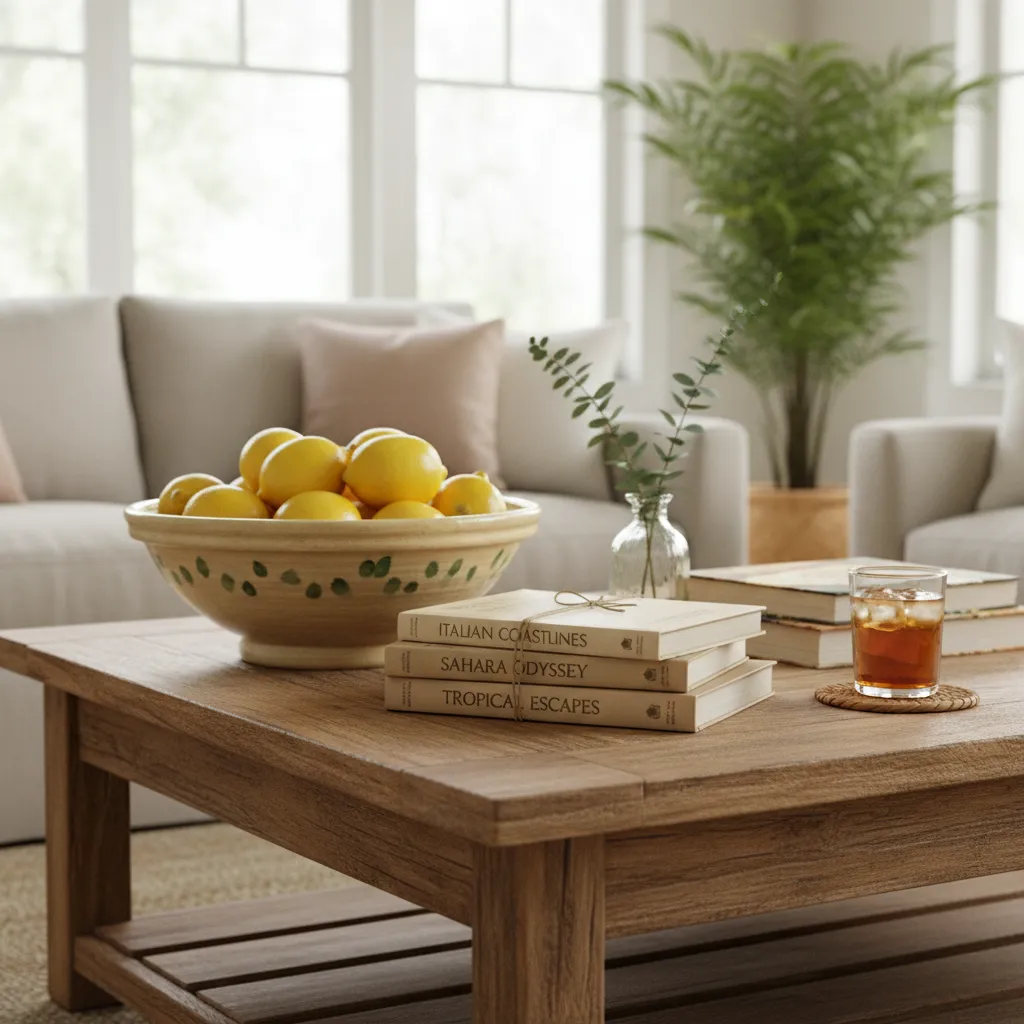 Clear off your coffee table and build a new seasonal vignette. A stack of bright travel books and a bowl of fresh lemons works perfectly for summer. For fall, swap the lemons for a wood bowl filled with pinecones and add a brass candle snuffer.