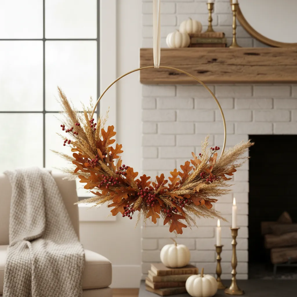 Wreaths are not just for the front door. Hang a minimal, modern hoop wreath above your mantel, on a large mirror, or over a bedroom window. Use dried florals for fall and fresh boxwood for winter.
