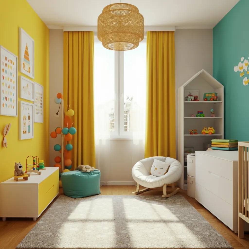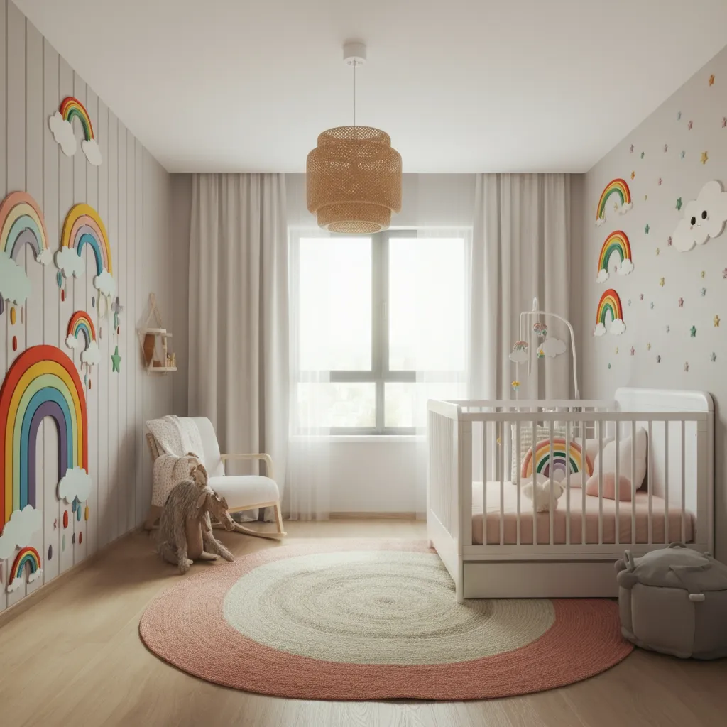 Soft pastels such as blush pink, mint green, pale yellow, and sky blue create a calm atmosphere. Neutral tones like beige, cream, and gray can be paired with brighter accents for a balanced, whimsical look.