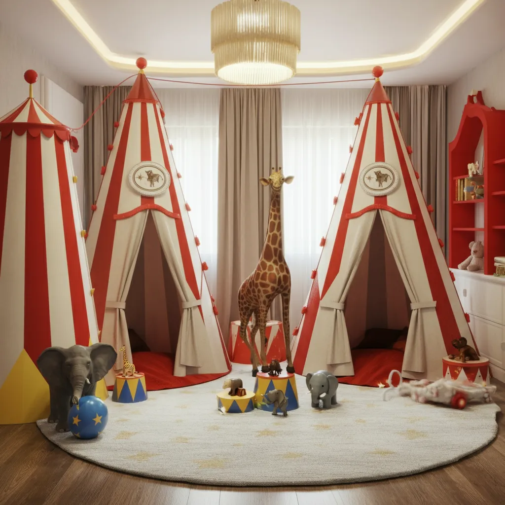 Add circus-themed decor like striped tents, animal figurines, and bright colors for a playful nursery.