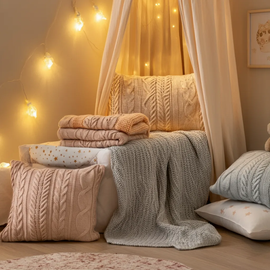 Incorporate knitted blankets, pillows, and decor for a warm and cozy nursery.