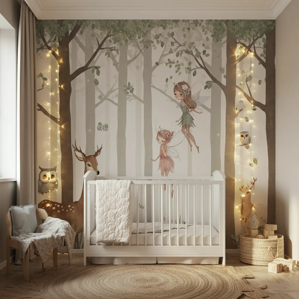 Add fairy lights, tree decals, and magical creatures for an enchanted forest theme.