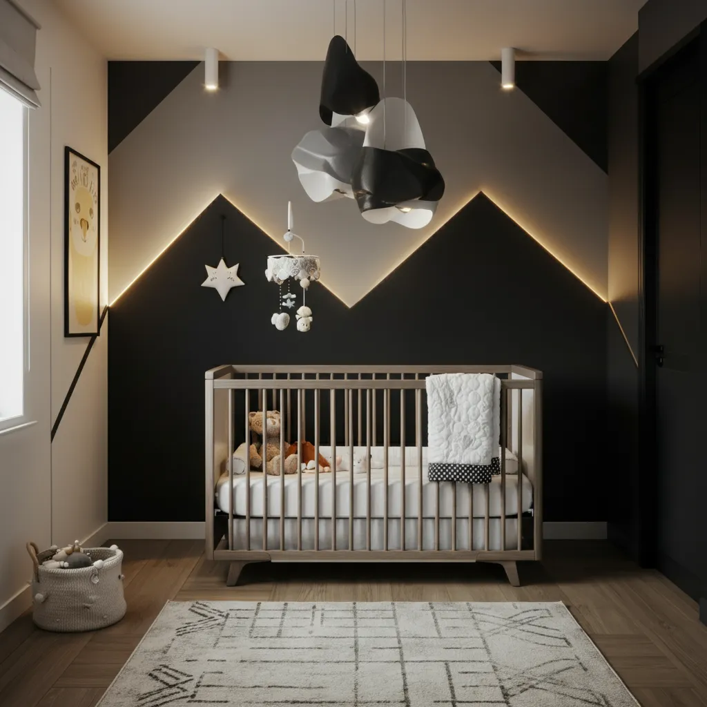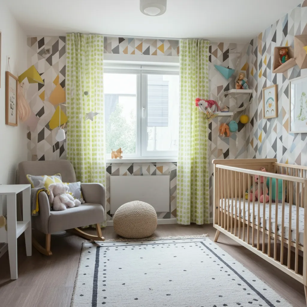Incorporate bold geometric shapes in wallpaper, rugs, and decor for a trendy nursery.